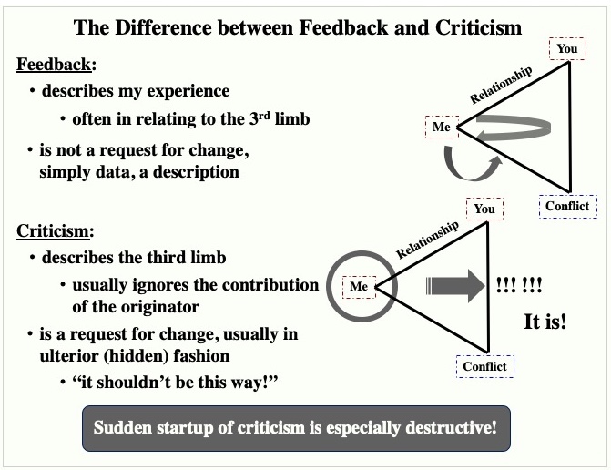 A major example here is the distinction between feedback and criticism. In feedback, I give you information about myself that you cannot obtain in any other way — I tell you my experience. There is no requirement that you be different; it is simply a description of what I am experiencing, and generally I tell it in the hopes that our relationship will improve. In criticism however, I want you to be different — you should be different (according to me). The operational word here is should!