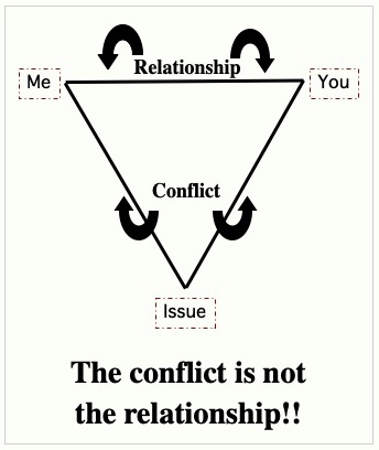 First, a diagram of importance, an emotional triangle. Imagine a triangle consisting of two people (me and you) and an issue (a conflict). Most people will say: “Let’s resolve this conflict so we can feel good about each other.” They put the conflict in the middle of the relationship. Instead, Joe said: “Let’s feel good about each other as we resolve our conflict.” Note the difference. The emotional triangle makes it clear that the conflict is not the relationship; it is part of the present difficulties of these two people, only a part of the relationship.