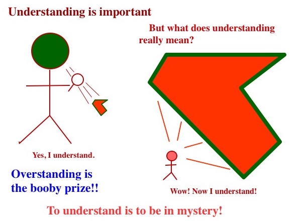 This word understanding is one that is vital to our conversation. With my clients, I draw two simple diagrams. The first stick figure is using a magnifying glass to analyse an object, saying “Yes, I understand.” The second stick figure is standing under the same object, in awe of the mystery that the object represents. Despite the profound scientific advances of the past few hundred years, we really grasp little of the profound mystery that underlies what we call reality. Thus I call the first analysis over-standing and the second true under-standing, usually spelling the words with a hyphen to underlie the mystery. Over-standing, for me, is the bobby prize!